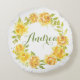 A bright and whimsical botanical round pillow. It features watercolour floral wreath of yellow roses and peonies with greenery accents and a whimsical script. Personalise by adding a monogram. This yellow floral wreath pillow is perfect as a personalised gift.