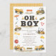 Cute Oh Boy Baby Shower design featuring yellow construction trucks with construction signs and tools. Visit our shop to view this design in other colours.
