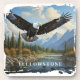 This plastic coaster set is shown with an art print of an eagle flying high in the famous Yellowstone National Park.