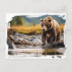 This postcard is shown with a photo print of a grizzly bear in the river in the forest of Yellowstone National Park.