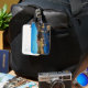 This luggage tag is shown with a photo print of a wild moose in Yellowstone National Park.