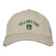 Sunshade featuring Yellowstone National Park with tri-colour camping symbol; all professionally embroidered. Looks great on distressed stone-coloured cap, but mix and match. Bonus: bottom left of hat also features an additional camping symbol for side viewing action. (Check out the side view.)