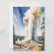 This postcard features a watercolor of Old Faithful geyser in Yellowstone National Park.