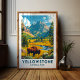 This poster vividly portrays the essence of Yellowstone with its majestic mountains providing a dramatic backdrop to the lush valleys below. In the foreground, a herd of bison roams freely, embodying the spirit of the wild and the park's rich natural heritage. The expansive sky and serene atmosphere evoke a sense of peace and adventure, inviting you to explore this iconic wilderness.