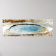 A colourful panoramic photograph of a thermal pool in Yellowstone National Park.