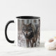 This ceramic coffee mug is shown with a photo print of wild wolves in Yellowstone National Park.
