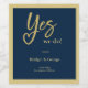 This elegant navy blue and gold wedding design features the phrase “Yes we do!” with the word “Yes” written in a romantic gold script — the sweeping Y cleverly incorporates a heart shape, symbolising love and unity. The minimal chic layout combines bold modern typography with timeless gold accents, creating a luxurious look perfect for formal events, navy blue tie celebrations, or evening weddings. The names are displayed in graceful calligraphy, adding a touch of personal charm to this sophisticated stationery.