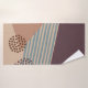 This towel set has a beige washcloth, a brown hand towel, and a bath towel with a mid-century modern abstract design of a blue line, a tan triangle, and a brown circle made of dots on a field of dark eggplant and cream. If you want the same design with different colours, message me.