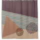 This shower curtain has a mid-century modern abstract design of a blue line, a tan triangle, and a brown circle made of dots on a field of dark eggplant and cream. If you want the same design with different colours, message me.