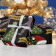 A fun festive gift wrap with Bigfoot and his winter friend the Yeti trimming the tree and wrapping presents.
