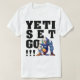 The T-shirt design features a whimsical yet detailed illustration of a Yeti, chraacterised by its large, furry appearance, with exaggerated muscular build, adding to the humourous aspect. This Yeti is dressed in a colourful track uniform, complete with shorts, a tank top, and running shoes, giving it a sporty, ready-to-run look. The Yeti's facial expression conveys determination and enthusiasm, as if it's on the starting blocks of a race. Behind the Yeti, in a large, bold, and playful font, are the words "Yeti, Set, Go!" These words playfully replace the phrase "Ready, Set, Go!" The background of the words blends seamlessly with the overall design, adding a dynamic and fun element to the shirt. The design is meant to evoke laughter and motivation, appealing to those with a love for sports, humour, and mythical creatures.