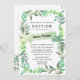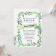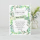 Leaf clusters in shades of green frame the invitation. A simple ribbon highlight's the child's name.