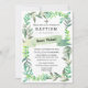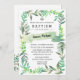 Leaf clusters in shades of green frame the invitation. A simple ribbon highlight's the child's name.