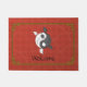 The dark Yin and light Yang the koi swim around one another creating a classic Chinese Taijitu, representing harmony and balance in all things. A classic Chinese border in gold frames the two fish, and a faint pattern of Chinese symbols for wealth, longevity, double happiness, and good fortune on a red background complete the design.