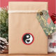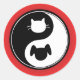 An atypical yin yang symbol inside a red circle, with a cat and dog engaged in the endless chase.