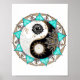 Mandala design based on the Chinese philosophy of opposing forces yin and yang. The two forces are surrounded by a white, gold, and silver mandala design and adorned with an eye, feathers, and a gold and silver flower design.