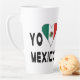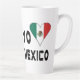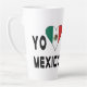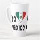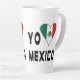 Large latte mug uses a heart shaped Mexican flag instead of the word LOVE, or AMO. Design reads YO AMO MEXICO, or I LOVE MEXICO, on two sides. The flag is green, white, and red with an eagle in the centre. Fun on Cinco de Mayo. Great housewarming gift.