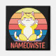 Colourful illustration with "Nameowste" text design and cute Kawaii cat is doing yoga on colourful striped retro background
