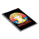 Colourful illustration with "Nameowste" text design and cute Kawaii cat is doing yoga on colourful striped retro background