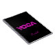 A college ruled notebook for your yoga routine, fitness workout. For planning, meditation organising and recording your progress. A stylish black background, the tekst YOGA with symbols. Add your own name, purple hand lettered script.