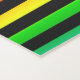 Rainbow stripes run vertically with black stripes separating the colours. Three circles run down the centre with the black stripes altered to horizontal and the central rainbow colours have a more blurred effect.