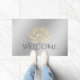 Yoga Studio Meditation Instructor / Life Coach / Healer / Reiki Master / Massage Therapy Welcome Doormat Templates - Modern Elegant Faux Gold Foil Lotus on Silver Floral Damask Background.
