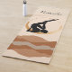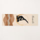 Namaste. Black silhouette yoga pose on a gold crescent moon above a modern abstract neutral mountains background. Black text in a modern handwritten font says Namaste or it can be personalised with your own text.
