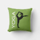 A pillow with a simple design of a black silhouette of a woman performing a yoga pose. Set on a green background with yoga written in white.
