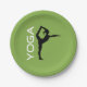 Paper plates with a simple design of a black silhouette of a woman performing a yoga pose. Set on a green background with yoga written in white.