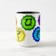 White glass coffee mug with all main yoga reiki seven chakra symbols printed on in full detail in the visible light spectrum order using the representing colours red through violet from left to right with coloured name labels for symbol identification!