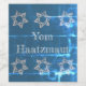 A distressed blue background sparkles behind white Stars of David. The text, Yom Haatzmaut, is in template format and can easily be changed using the personalise button.