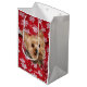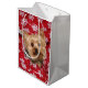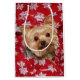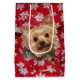 Yorkie, or Yorkshire terrier, dog is happily playing with the Christmas gift wrap on this cute dog lovers Christmas holiday gift bag