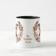 A pretty autumn wreath in tones of cinnamon brown, tan, and cream surround the watercolor image of an adorable Yorkshire Terrier dog. The image is printed twice on the mug, with your custom text between them.