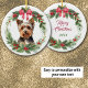 This pretty Holiday ornament features a beautiful watercolor portrait of a little Yorkshire Terrier Dog. The Yorkie is framed with a holly and red berries wreath, with a bright red bow at the top. The back of the ornament has the same red bow wreath, with two text fields for you to customise.