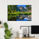 This photo features Yosemite Falls reflected perfectly in an outlet of Merced River by Swinging Bridge, Yosemite National Park, California.