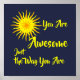Raise self esteem with this positive message of validation and appreciation! Great as a gift or to hang on home or office wall as a positive affirmation for yourself. See our collection of these Positive Inspirational Prints and Posters. This design includes a bright yellow orange sun and the text "You Are Awesome Just the Way You Are".