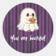 Add a spooky-cute touch to your gifts, cards, or party favours with these adorable Halloween stickers! Featuring a smiling ghost hugging a pumpkin on a purple-and-black striped background, with the playful phrase “You are bootiful.”