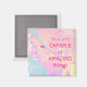 A modern abstract design with the encouraging words You Are Capable of Amazing Things to display on your fridge. A simplistic line art female face, mouth and hand holding the rim of her hat, with a pretty art backdrop in a mix of pinks, yellows and touch of teal. You can personalise the words if you so wish.