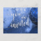 The words "you are invited" were rendered in a beautiful, modern handwriting font and added as an image overlay. The photo behind features an original photo, toned in blue, of a cluster of Christmas tree ornaments, shot close-up. The ornaments are cracked glass and glitter-enhanced balls.
