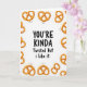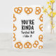 This card shows a funny, affectionate message surrounded by a border of golden-brown pretzels. In the center, on a white background, the text reads “YOU’RE KINDA Twisted But i Like it” in black, simple sans-serif letters. The words sit right in the middle, with plenty of space around them so the message is easy to read. Around the edges, pretzels appear whole and partly cut off, as if there are more just outside the frame. Each pretzel looks toasted and slightly textured, with little white salt bits scattered on top and sizes that vary a bit. A few small gray bracket-like marks sit near some pretzels, adding a small graphic detail without distracting from the main joke. It feels meaningful because it’s a sweet way to say “I like you as you are,” with a little teasing that can fit romance or close friendship 🥰❤️.