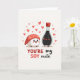 This greeting card shows a cute nigiri sushi and a smiling soy sauce bottle as friendly characters on a soft cream background. The sushi is white with a red piece of fish on top, and it has big bright eyes and pink cheeks. Next to it, the soy sauce bottle is dark black with a red cap, and it has the same happy face, looking like it’s hanging out with its best match. Small red hearts float around them, making the whole scene feel romantic and sweet ❤️. Near the bottom, the card says “YOU’RE my SOY mate,” with “YOU’RE” and “SOY mate” in clear block letters, and “my” smaller in the middle. The simple colors—white rice, black bottle, and red accents—make the characters and hearts stand out right away 💌🍫. Hope this helps you share your Valentine’s Day feelings with someone special in a kind, easy way.