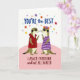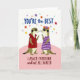 This greeting card shows two cartoon meerkats facing each other on a white background, with a soft pink curved ground under their feet. One meerkat wears a red puffer vest with a little zipper detail, and the other wears a purple striped dress with an orange-and-purple flower headband. They have gentle smiles and bright black eyes, and their raised paws make it look like they’re sharing a friendly moment. Above them, the text “YOU’RE the BEST” appears in friendly blue block letters near the top, surrounded by small stars in pink, orange, purple, yellow, and blue. Below the pair, a second message reads “I ASKED EVERYONE and WE ALL AGREED.” in a maroon, handwritten-style script near the bottom. The overall feel is warm, supportive, and perfect for romance, affection, or close friendship, with a sweet Valentine’s touch ❤️❤️