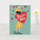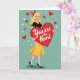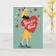 This Valentine’s card features a cheerful blonde woman styled with a classic 1950s look. She stands at the center with a bright smile and sparkling blue eyes, dressed in a black top, sunny yellow skirt, and black heels. Her curly hair is tied with a red and blue bow, adding a fun vintage touch. She hugs a large red heart close to her chest, with the message “You are the Heart” written in elegant white lettering. The teal background is dotted with small red hearts and white star shapes, creating a festive, loving mood. With bold colors and a heartfelt message, this card is a joyful way to show someone how much they mean to you on Valentine’s Day. ❤️