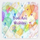 The decal stickers message notes, "You Are Worthy." The painting features overlapping hearts in a rainbow of colours. The heart images are drawn and painted in watercolor. A single large heart defines the border between the drawing and painting heart images. The art is a tribute to the community of love and friendship in our lives as it overlaps with the world.