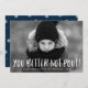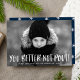 Cute holiday photo card featuring your horizontal photo with "You Better Not Pout!" in white handwritten lettering. Personalise the front of the funny holiday photo card with your custom greeting, family name, and the year. The card reverses to a navy and white snowflake pattern. This Christmas card is perfect for displaying photos of your kids pouting, crying, etc.!