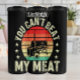 This graphic features a humourous design with a silhouette of a smoker against a retro striped sunset. The text 'YOU CAN'T BEAT MY MEAT' is in a bold, distressed font, creating a witty and simple graphic perfect for a barbeque enthusiast or grill master.