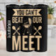 This humourous graphic features a simple illustration of a barbecue grill flanked by a fork and spoon. The design has a distressed, vintage feel and includes the witty text 'YOU CAN'T BEAT OUR MEAT,' creating a simple and fun graphic for a grilling enthusiast.