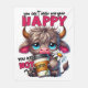 A funny, sarcastic, and colorful design showcases an adorable highland cow with big blue eyes, brown fur, and a sad expression, holding a steaming cup of coffee and a daisy. The vibrant text reads, "You can't make everyone happy, you are not coffee." This charming design is available on a variety of products, making it a perfect gift for coffee lovers.