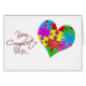 Don't let them 'puzzle' over how much they mean to you. This design says it all, "You Complete Me." Fun, brightly coloured puzzle pieces are completed to create a heart. Perfect for Valentine's Day or just to show them how much you love them.