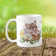 "You had me at MEOW" declares this mug in brown text. Your name or other personalisation is in green below. On either side is a watercolor image of an adorable tiger striped kitten in a basket with a spring flower bouquet. A smattering of gold confetti adds extra interest to the image. Perfect for anyone who has lost their heart to a cat.